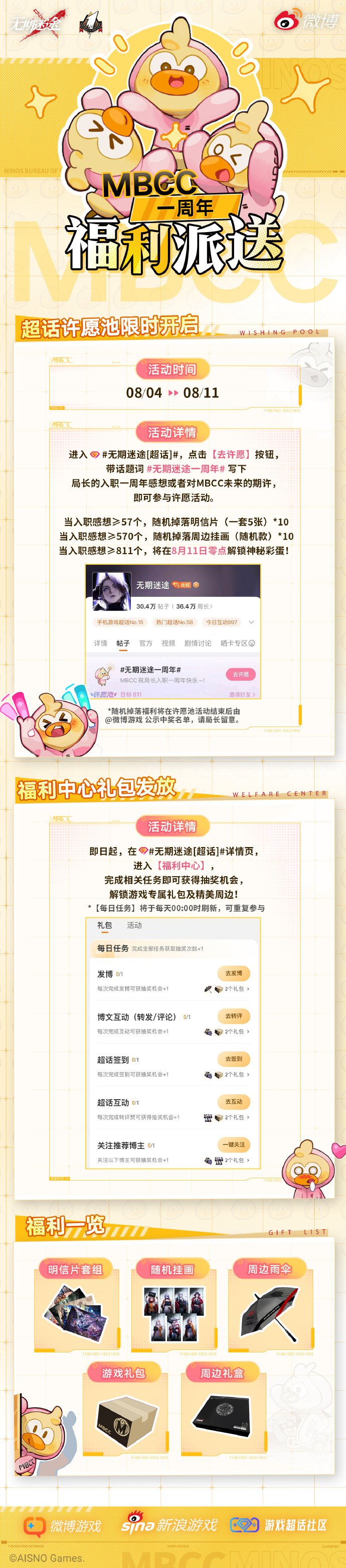 进入无期迷途超话,点击【去许愿】按钮,带话题词 #无期迷途一周年# 写下局长的入职一周年感想或者对MBCC未来的期许,即可参与许愿活动。