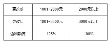 返还比例100%档位,充值额度区间从“2000元以上”提高至“3000元以上”。