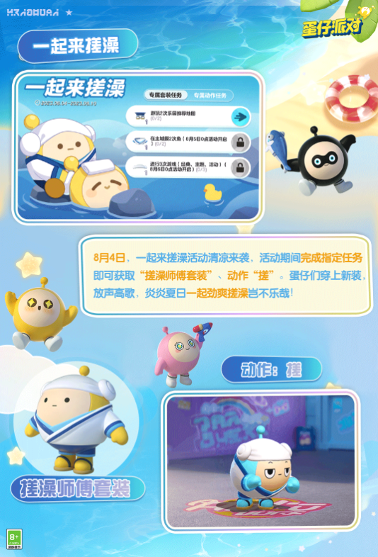 蛋仔们完成专属任务即可集齐【搓澡师傅套装】并获得动作【搓】!1号搓澡师傅皮蛋已准备就绪,势必要让每个蛋仔皮肤锃亮发光!