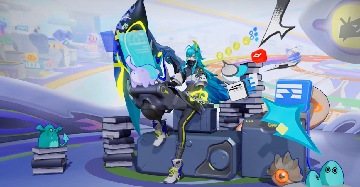 同时,我们将小说内容实体化的概念体现在装饰设计上,弹幕感十足的对话框、键盘按键剪影等元素的装饰,让人物整体更加动感,发型设计上,充满夏日氛围的蓝绿色长发,装饰代表小说家身份的羽毛笔。