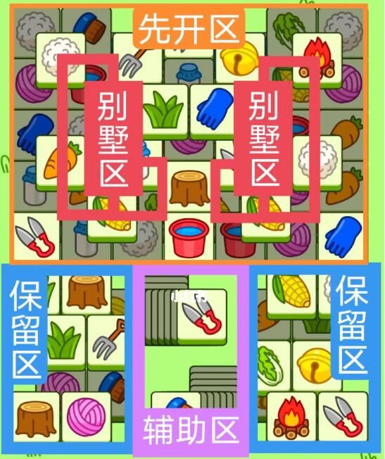 两个儿L字型大别墅组成,开局先消除橙色区,然后按照一层层均匀消除表面牌,哪里压牌比较多就先消除哪里,必要时可以用盲盒区辅助消除表面牌,尽量还是以别墅区内互相消除为主,蓝色区有叠牌,但是不多,全部保留到后期使用。