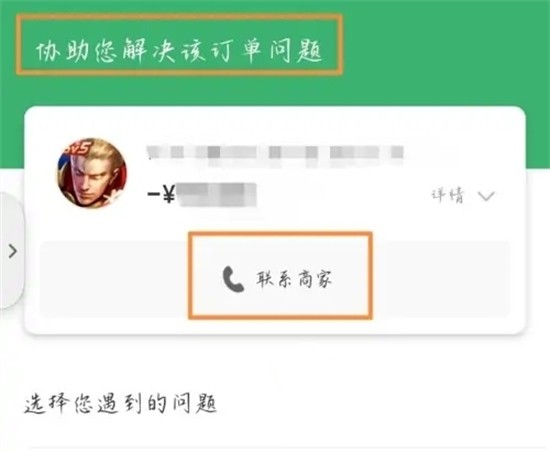 4、进入“协助您解决该订单问题”页面,点击联系商家,咨询王者荣耀退回充值的钱即可。