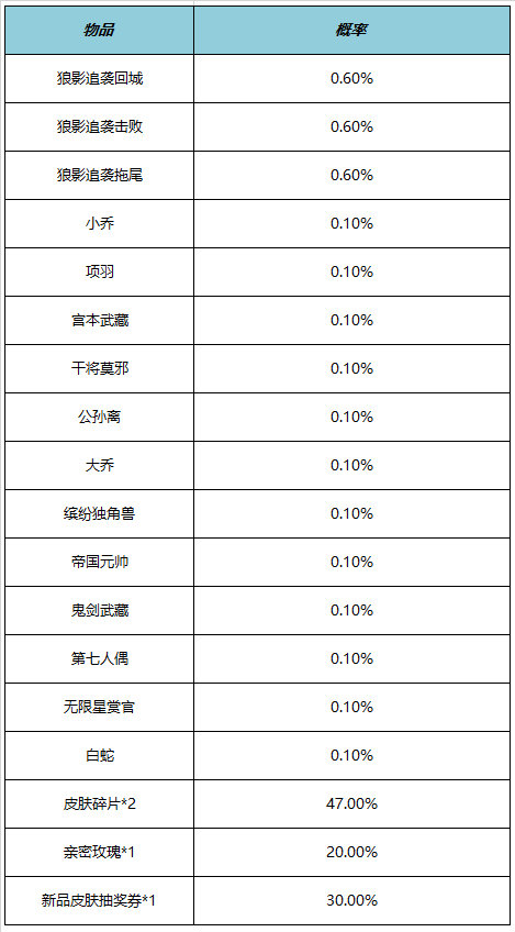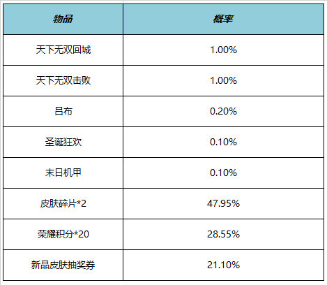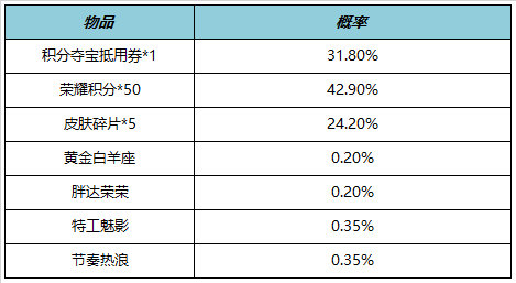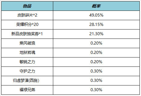 皮肤碎片&积分自选礼盒:打开礼包可任意选择以下奖励之一:荣耀积分*10或皮肤碎片*1