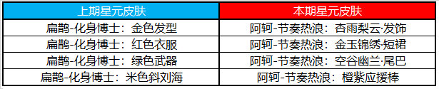 购买礼包必得红蓝对决(1日),可额外随机获得以下之一:狼影追袭回城、狼影追袭击败、狼影追袭拖尾、缤纷独角兽、帝国元帅、鬼剑武藏、第七人偶、无限星赏官、白蛇、小乔、项羽、宫本武藏、干将莫邪、公孙离、大乔、皮肤碎片*2、亲密玫瑰*1、新品皮肤抽奖券*1。累计225次必得全部局内特效。