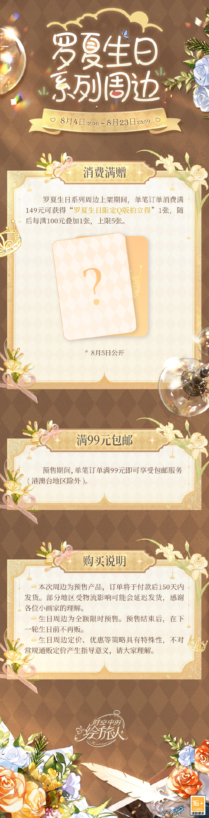 2. 生日周边为全额限时预售。预售结束后,在下一轮生日前不再贩。