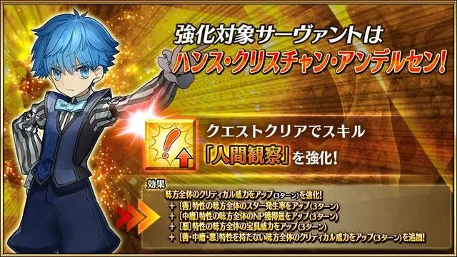 fgo日服对于这次的二星术阶的技能本,在一开始透露的时候,不少玩家都在猜测是否是陈宫开宝具本,当然这种猜想属于是追梦系列了,调侃的成分更多一些,实际上拿到强化的还是安徒生,陈宫追梦宝具本失败,具体说说这次安徒生的强化效果还有对于从者本身的影响。