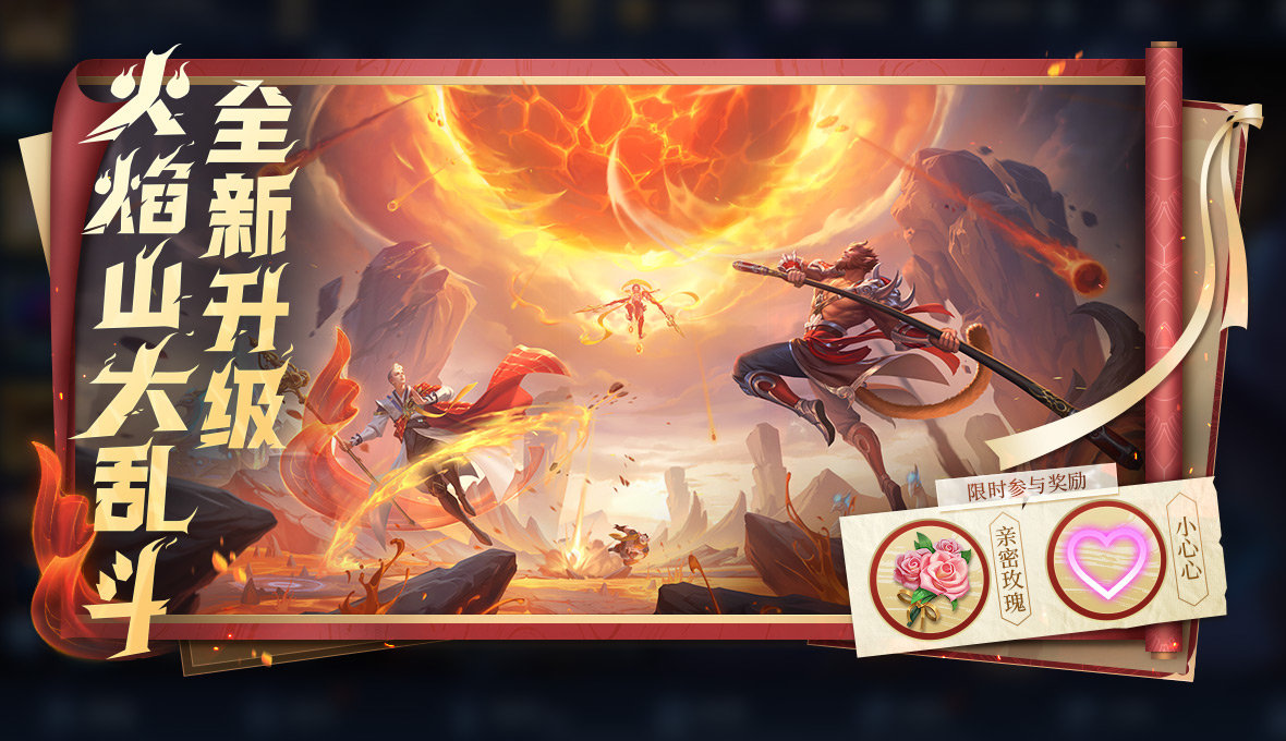火焰山大乱斗,全面升级上线!活动期间累计完成火焰山对局,得亲密玫瑰、个性戳戳 小心心!