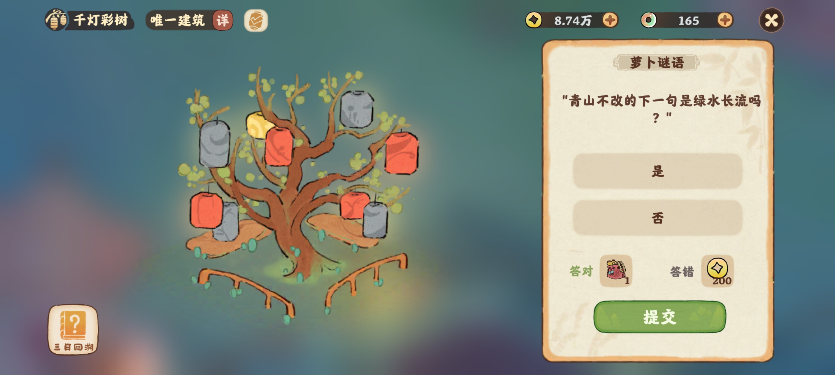 青山不改的下一句是绿水长流吗?桃源深处有人家的新建筑千灯彩树可以进行谜题答题,大家知道青山不改的下一句是绿水长流吗?下面为大家带来的具体内容,感兴趣的玩家们千万不要错过哦!