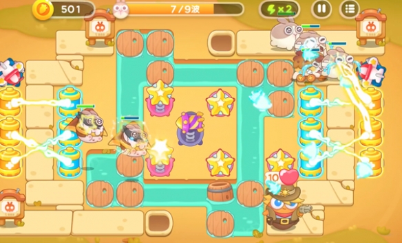 3、这时候会出现大量飞行兔兔的进攻,玩家得加强火箭的输出能力,在火箭筒庞放置两个星星装置。