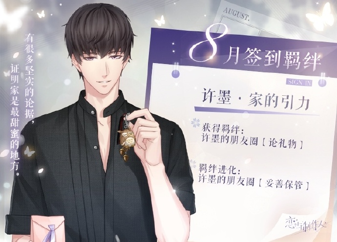 上述就是F4手游网小编给大家介绍的恋与制作人8月签到羁绊是什么 恋与制作人许墨家的引力羁绊介绍,希望对你有所帮助。