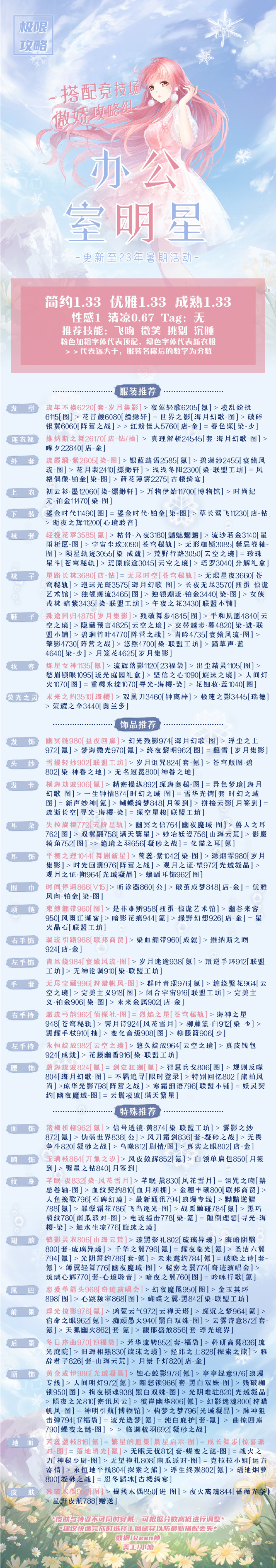 烁星女神1135 [氪] > 流辉落影1120 [23福袋] > 出尘精灵1105 [图] > 愁眉锁眼1095 [流光庭园礼盒] > 坚信之心1090 [旋沫之境] > 人间灯火1070 [图] = 重樱永绽1070 [寻光-海樱-染] > 花钿妆·蕊1040 [图]