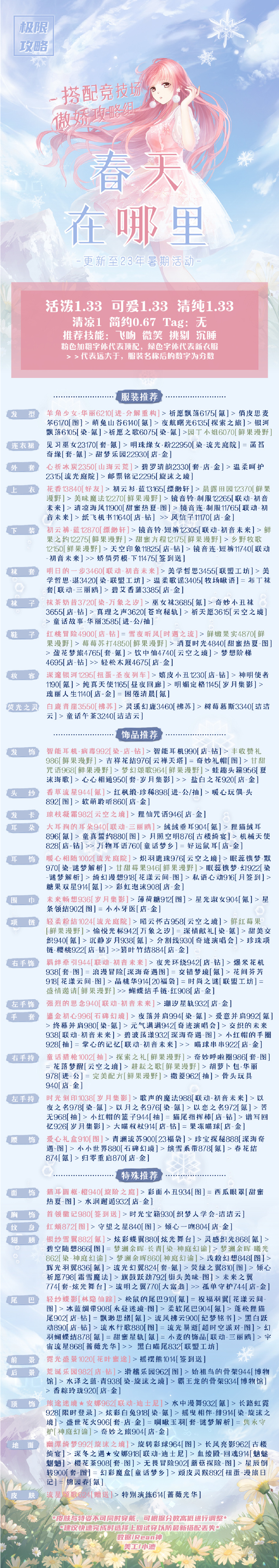 旅途迷境★安娜962 [联动-迪士尼] > 水中漫舞932 [氪] > 长路虹霓928 [限时登录] > 炫彩白兔918 [染-氪] > 摇曳相伴·绯914 [染-旋沫之境] > 盛世花火906 [套-店-金] = 啁啾玉羽 [套-谜梦解析] = 隽永守护 [神庭幻谕] > 奇妙之旅904 [店-金]