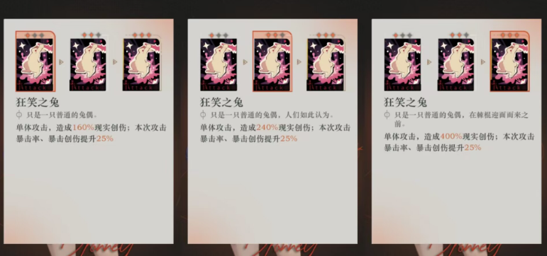 技能“狂笑之兔”是一个倍率只有160%但是暴击伤害和暴击率皆提升25%的技能。虽然这个技能有着对暴击伤害的特化,但由于其基础倍率较低,导致在技能都暴击命中时,“狂笑之兔”的伤害比“电锯惊魂”要低15%左右,但该技能二阶之后倍率提升较大。