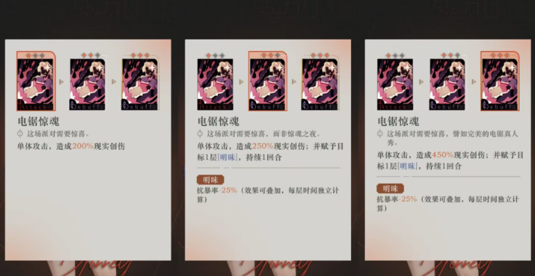 技能“电锯惊魂”是一个200%倍率的对单技能,在二阶后可以给对象赋予一回合“明昧”,但由于对倍率提升不明显以及明昧持续时间太短的问题,不推荐主动合成。