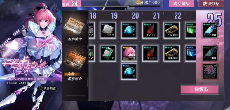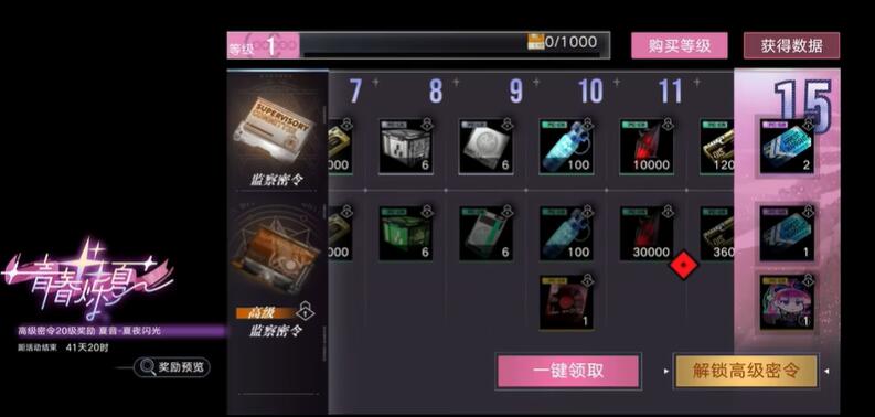 提升至20级并解锁高级监察密令后可获得【夏音·夏夜闪光】★★★限定装束等超值奖励,购买深度监察密令还可立即提升20级密令等级,并获得赛季专属头像框与狂级魂识印记*10。