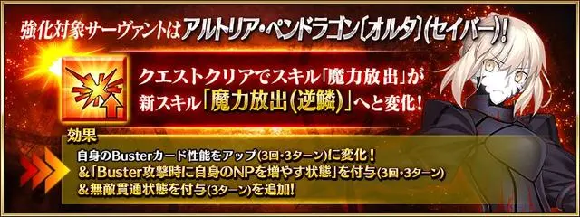 先说具体的强化效果,本次强化的是一技能,原本的效果就是1回合的红魔放,这次强化之后从原本的1回合变成了3次3回合的效果,同时追加了两个额外的效果,一个是付与「Buster攻击时自身的NP增加」的状态(3次·3回合),幅度是10NP。另外就是赋予了3回合的无敌贯通。