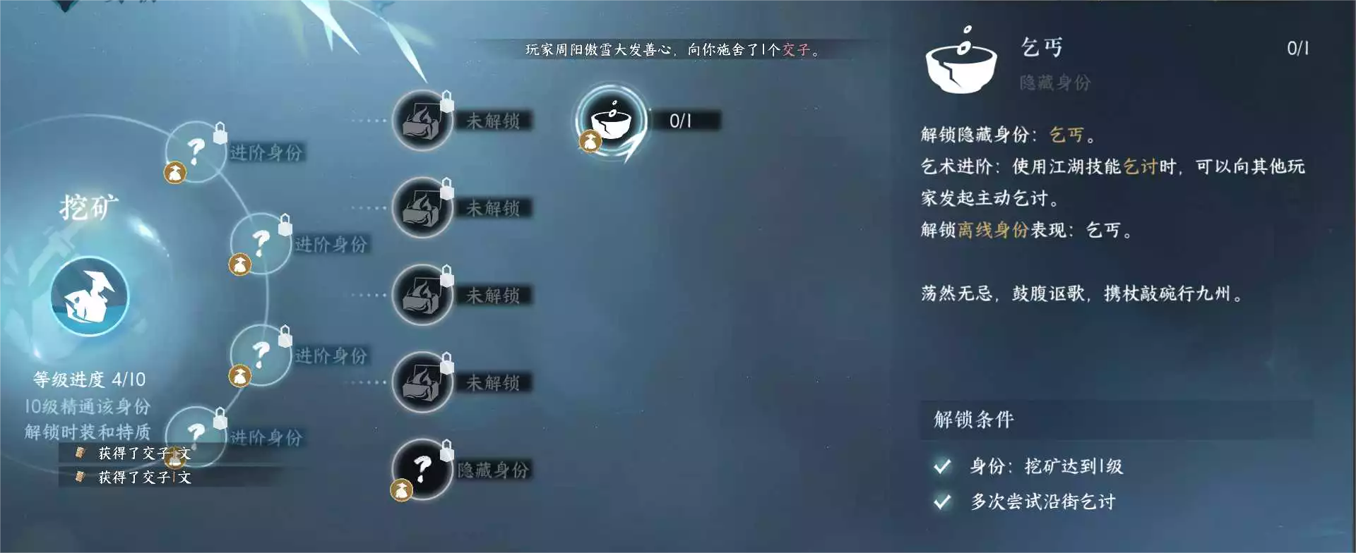 需要挖矿身份1级,即可在身份挖矿--技艺里解锁乞丐身份