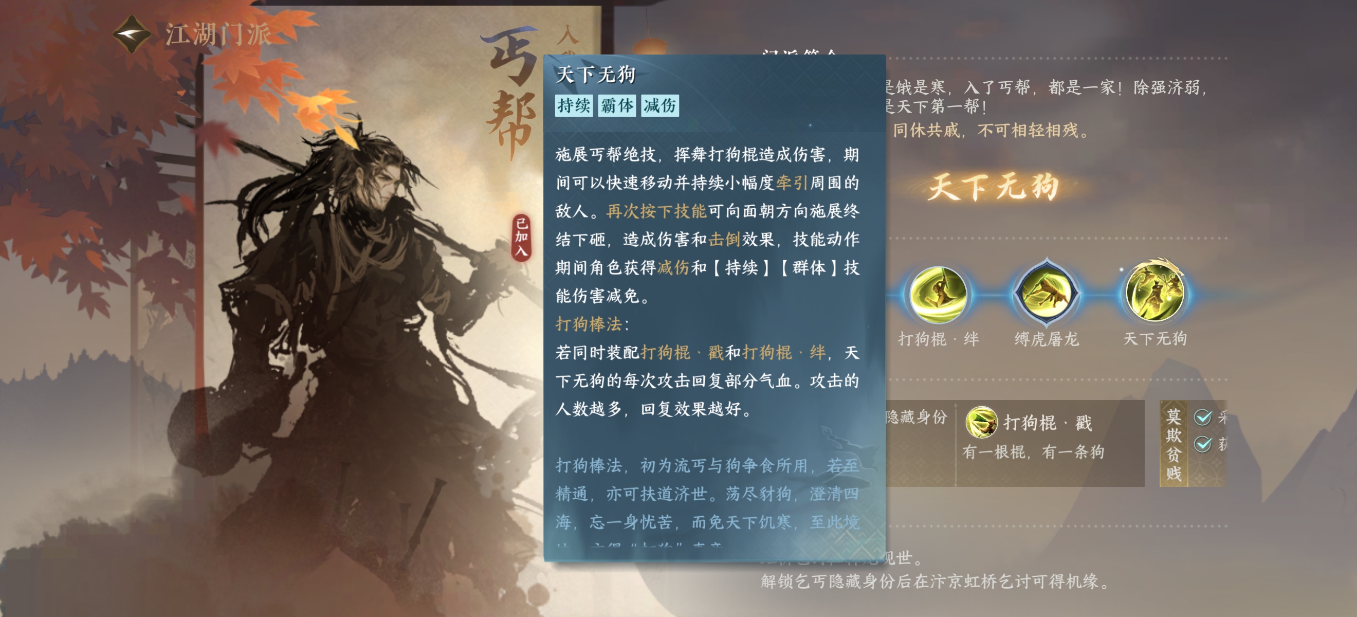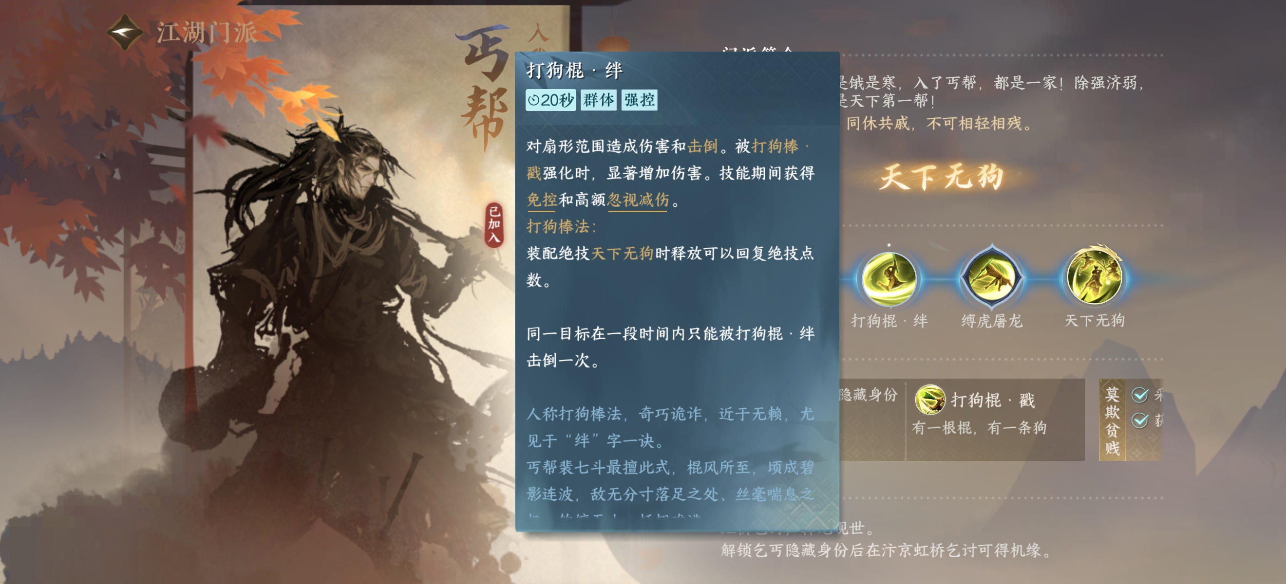 3.还是一样找到传功长老,点击对话学习丐帮绝技【天下无狗】,就此丐帮直接毕业。