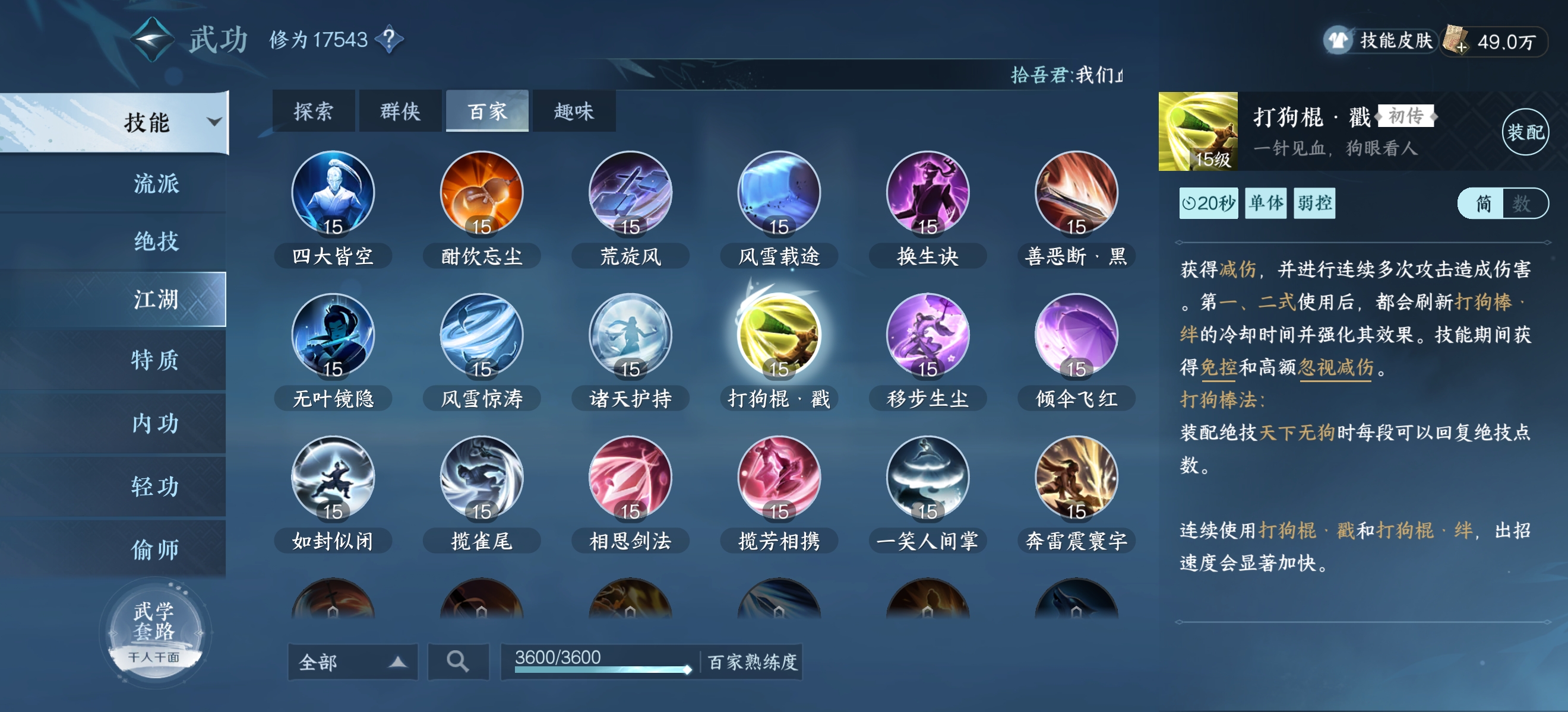 然后点击江湖门派界面的传功长老,可直接传回帮派,和长老对话学习【打狗棍绊】就可。