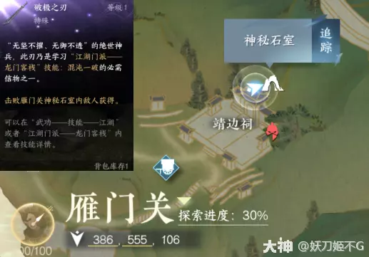 2.来到雁门关坐标(386,555)进入神秘石室,击败钢鬃野猪王,即可获得信物破极之刃