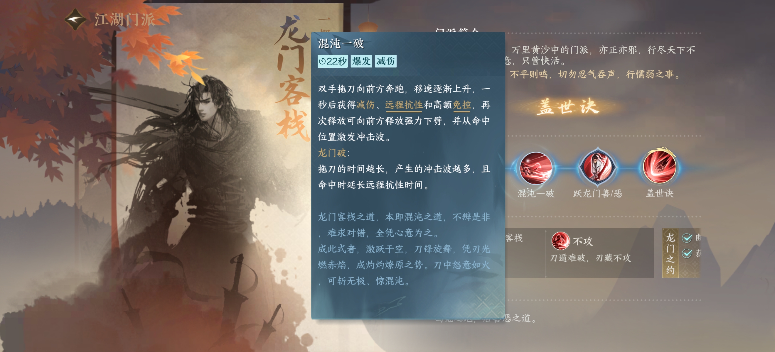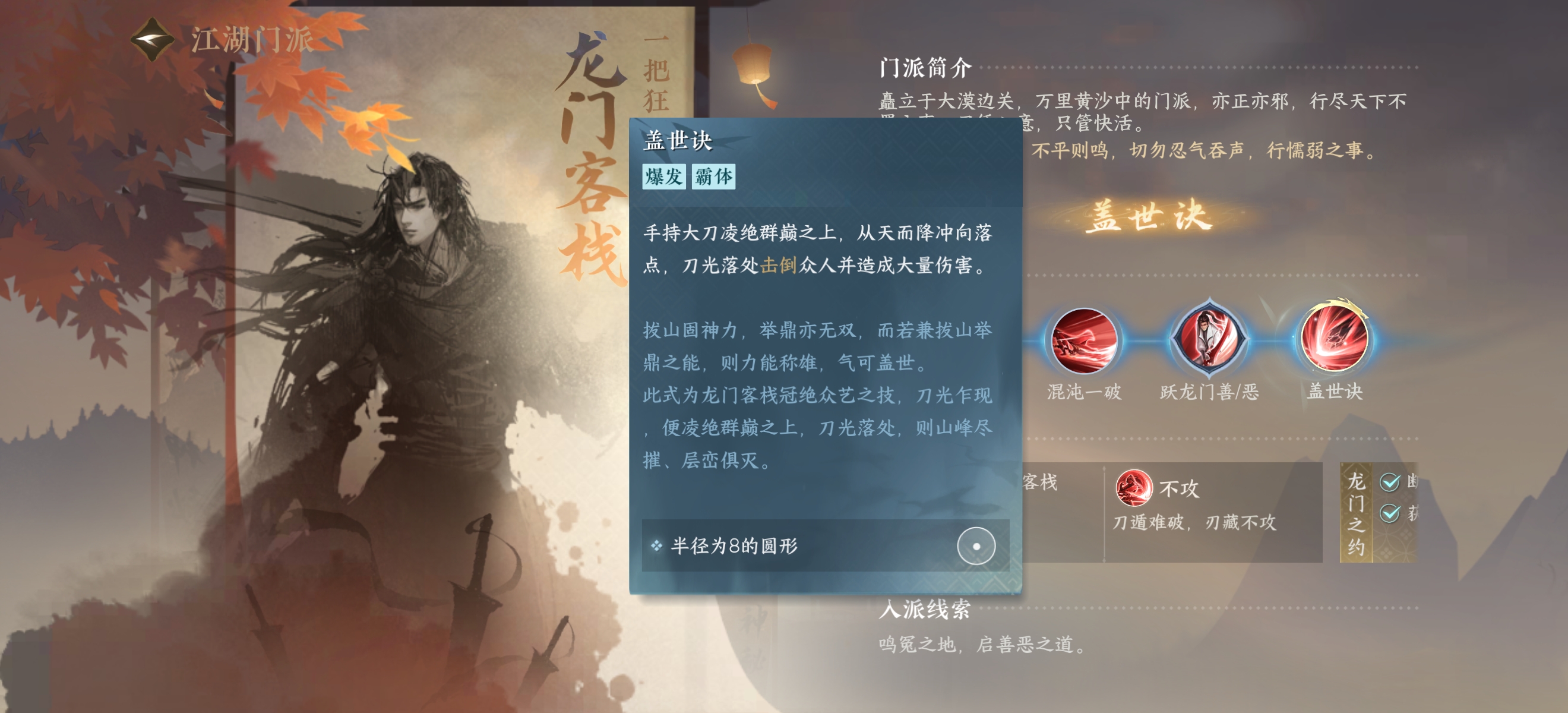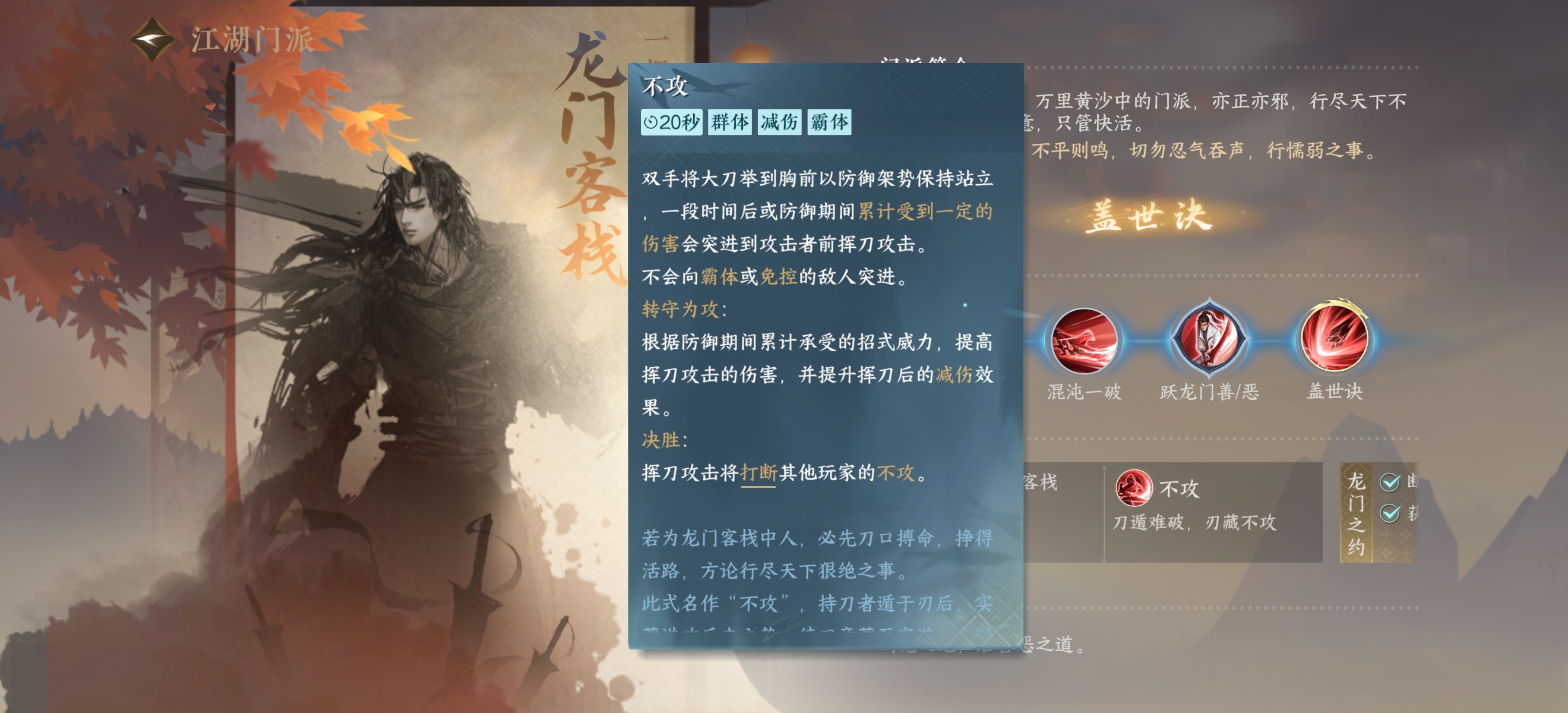 3.还是点击江湖门派界面的引路人,学习龙门客栈绝技【盖世诀】,学成之后就能毕业啦。