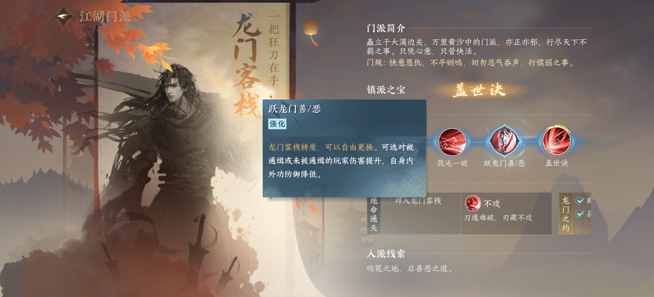 逆水寒手游中有许多的江湖门派,今天要介绍的龙门客栈是一个十分看中侠客义气的门派,同时龙门客栈的绝招技能也十分的炫酷,今天F4手游网小编带来逆水寒手游龙门客栈的进入方法和信物衣服技能的获取攻略,感兴趣的话一起来看看吧。