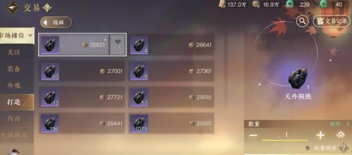 分解天外陨铁卖出可得二万八千铜币,每天可来回操作四次,可赚取中间价四万铜币,每月可赚一百二十万铜币!